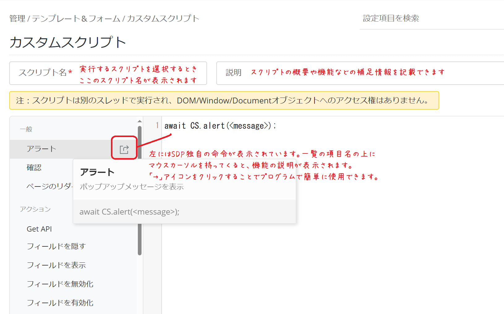 プログラミングには基本的なJavaScriptの命令が使えるほか、画面に表示されている項目の情報を取得・操作するためのSDP独自の命令が追加されています。