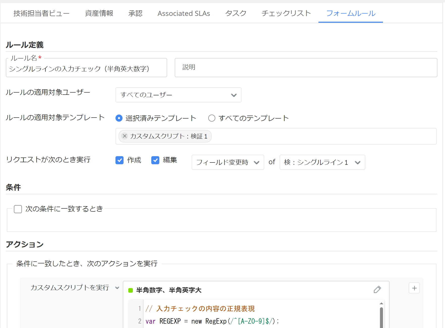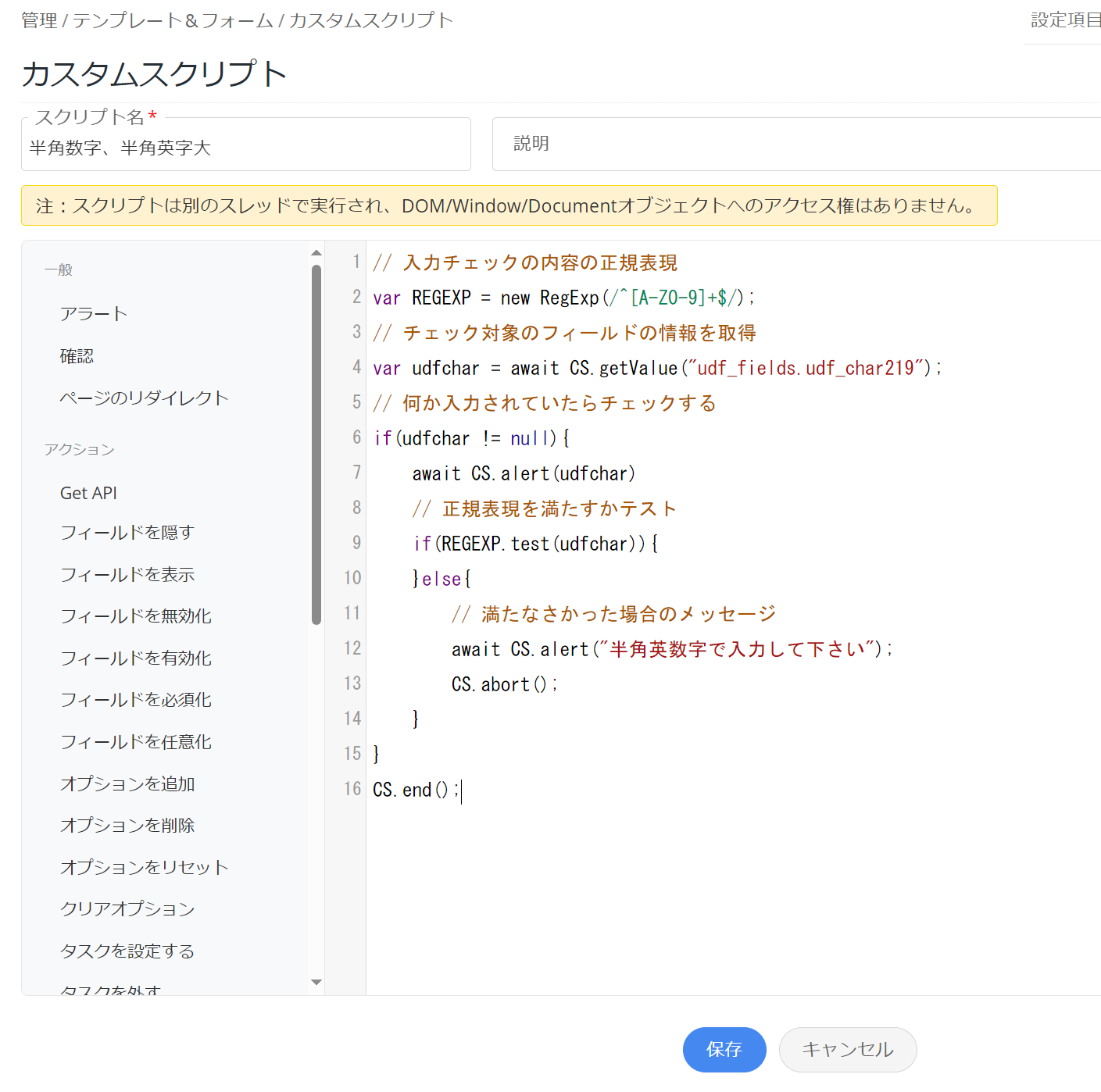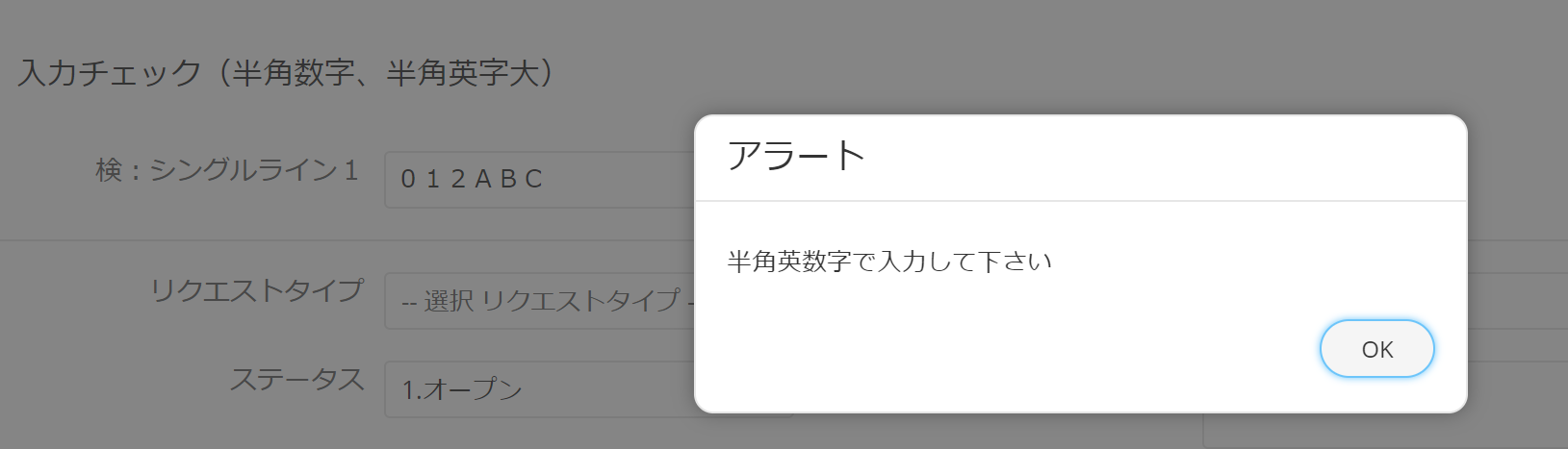 // 入力チェックの内容の正規表現var REGEXP = new RegExp(/^[A-Z0-9]+$/);// チェック対象のフィールドの情報を取得var udfchar = await CS.getValue("udf_fields.udf_char219");// 何か入力されていたらチェックするif(udfchar != null){await CS.alert(udfchar)// 正規表現を満たすかテストif(REGEXP.test(udfchar)){}else{// 満たなさかった場合のメッセージawait CS.alert("半角英数字で入力して下さい");CS.abort();}}CS.end();