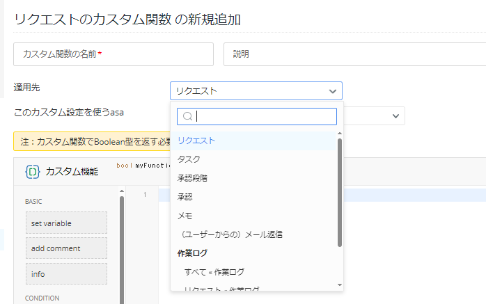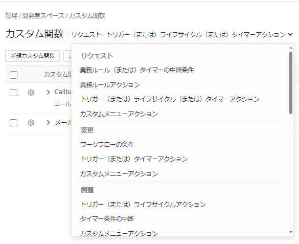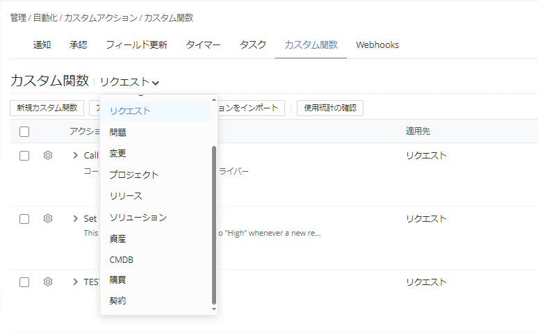 「カスタム関数」の右横にあるプルダウンリストから、カスタム関数を実行する対象となるモジュール(リクエスト/問題/CMDBなど)を選択します。