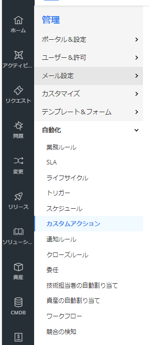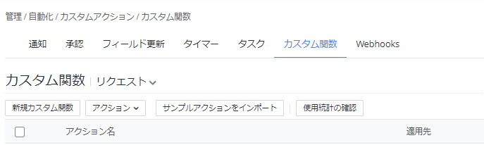 カスタム関数は、SDPの管理画面より [自動化] > [カスタムアクション] > [カスタム関数] から作成します。