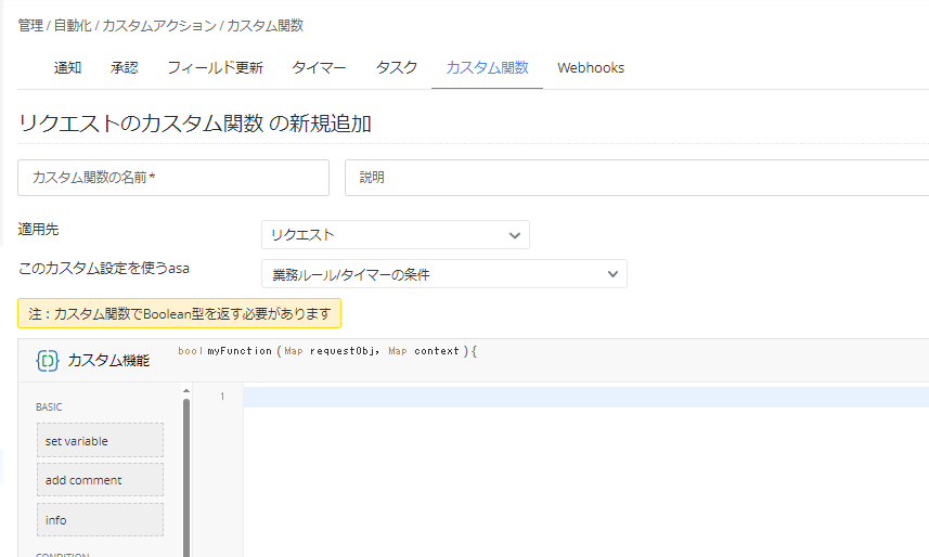 業務ルールを満たしたときに実行するアクションとしてカスタム関数を利用する