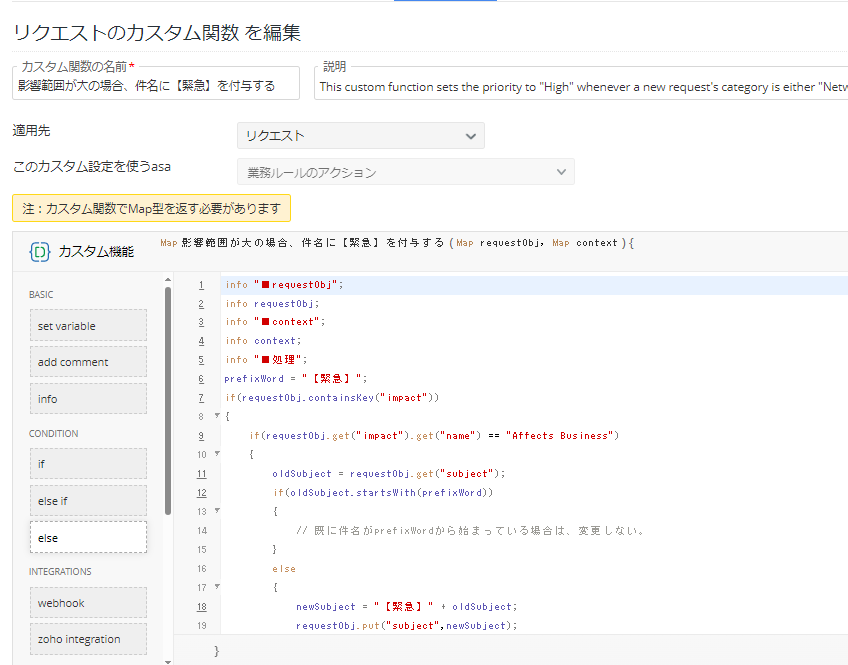 info "■requestObj";info requestObj;info "■context";info context;info "■処理";prefixWord = "【緊急】";if(requestObj.containsKey("impact")){if(requestObj.get("impact").get("name") == "Affects Business"){oldSubject = requestObj.get("subject");if(oldSubject.startsWith(prefixWord)){// 既に件名がprefixWordから始まっている場合は、変更しない。}else{newSubject = prefixWord + oldSubject;requestObj.put("subject",newSubject);}}}return requestObj;