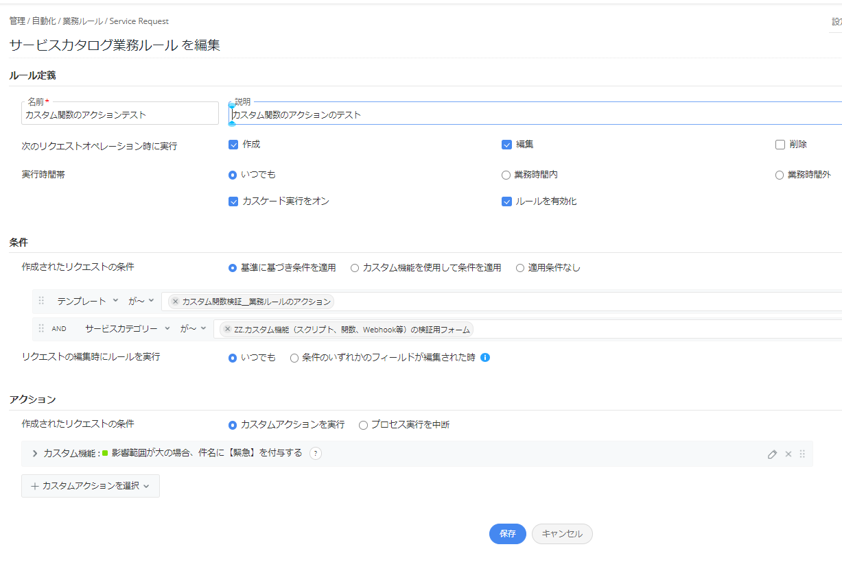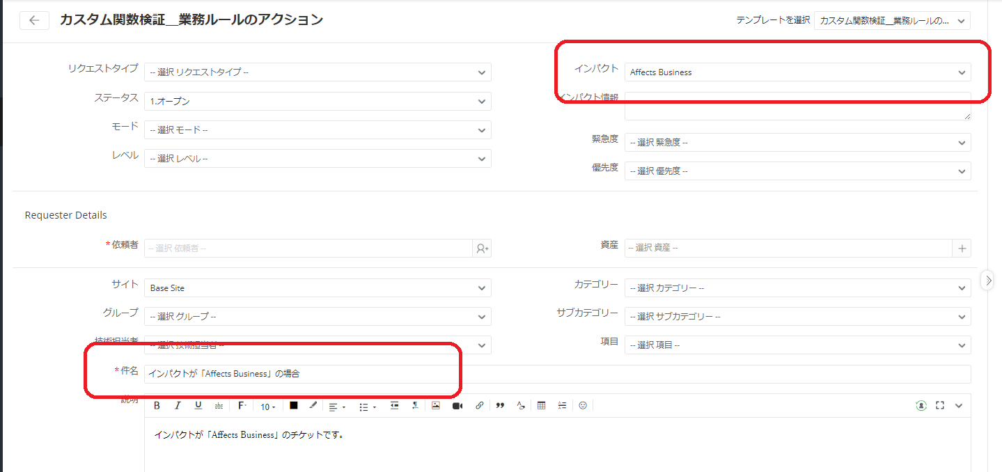 業務ルールを満たしたときにカスタム関数を実行することで、チケットの記載内容の編集や自動設定などができます。