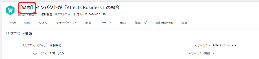 インパクトが「Affects Business」の場合、チケット登録後の件名に【緊急】とついています。