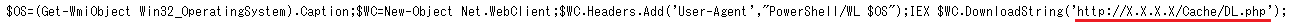 PowerShellのオプション「-E」以降のBASE64エンコードされている文字列をデコードすると、攻撃者のサイトから不正プログラム「DL.php」をダウンロードするPowershellスクリプトであることが分かります。(Figure-2)