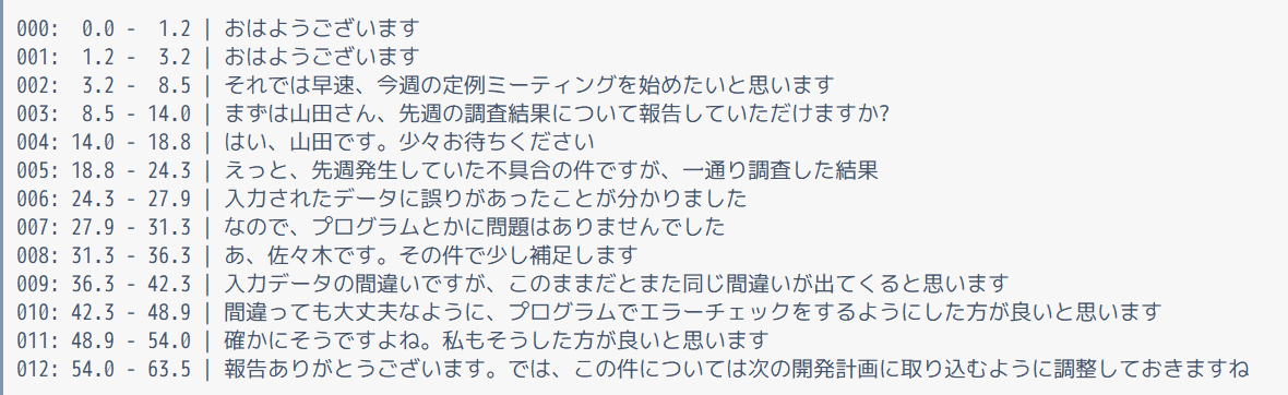 このままでは読みづらいため、以下のようなコードで「各セグメント単位」の情報を取得することも可能です。セグメント単位で処理すれば、それぞれの文章の開始・終了時間(秒)などの情報も取得できるようになります。