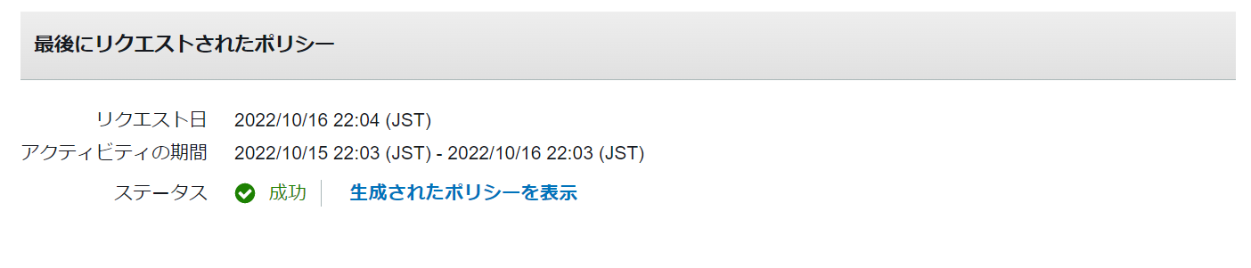 ここまでの流れで不足していたポリシーが作成され、IAMユーザーにアタッチされます。自分でCloudTrailのログを調べてポリシーを作っていくことと比べるとだいぶ楽ですね。ちなみにロールの場合でも同様にポリシーを作成してアタッチすることができます。
