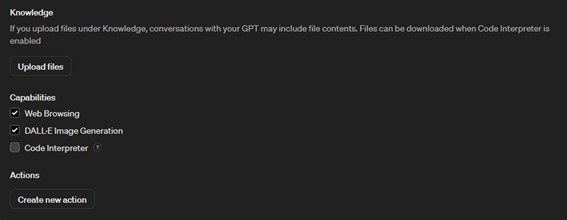 さらにGPTの設定には、「Knowledge」「Capabilities」「Actions」などがあります。
