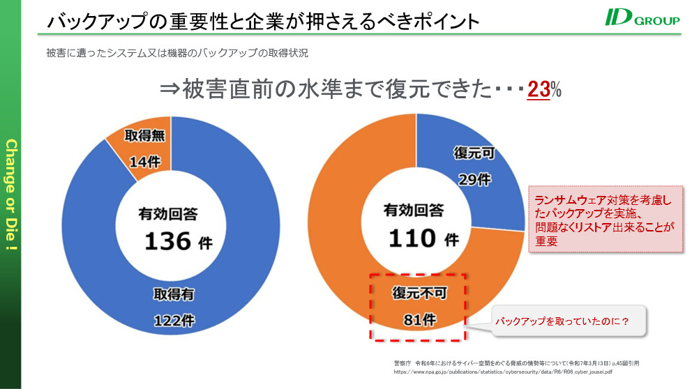 2025年現在、サイバーインシデントの件数は高止まりしており、新しい攻撃手法が次々と登場しています。令和7年3月13日に公表された警察庁の調査によると、バックアップを取得していた企業のうち、インシデント発生後に実際に復旧できたのはわずか23%でした。