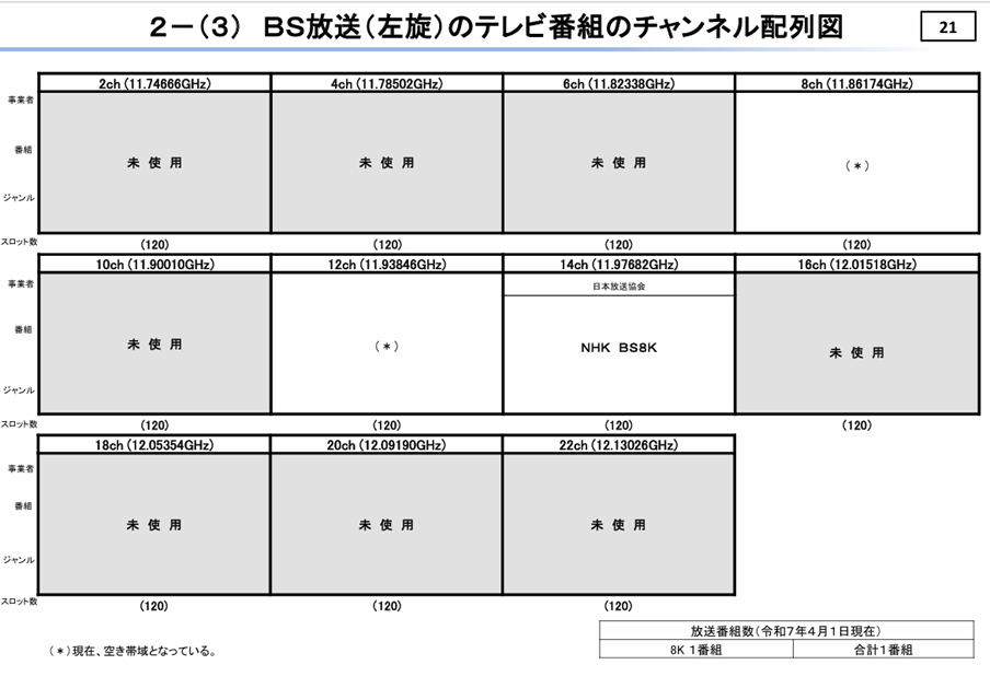 個人的にですが、新4K/8K放送に向けた帯域再編のため帯域削減の影響で2018年にBS2Kの多くのチャンネルが1,920×1,080ドットから1,440×1,080ドットに解像度が減らされ、地上波と同等の解像度になりました。4Kにリソースが必要なくなったのであれば、4K一局当たり33Mbpsの帯域が削減できるので、元に戻してほしいと切に願っています。
