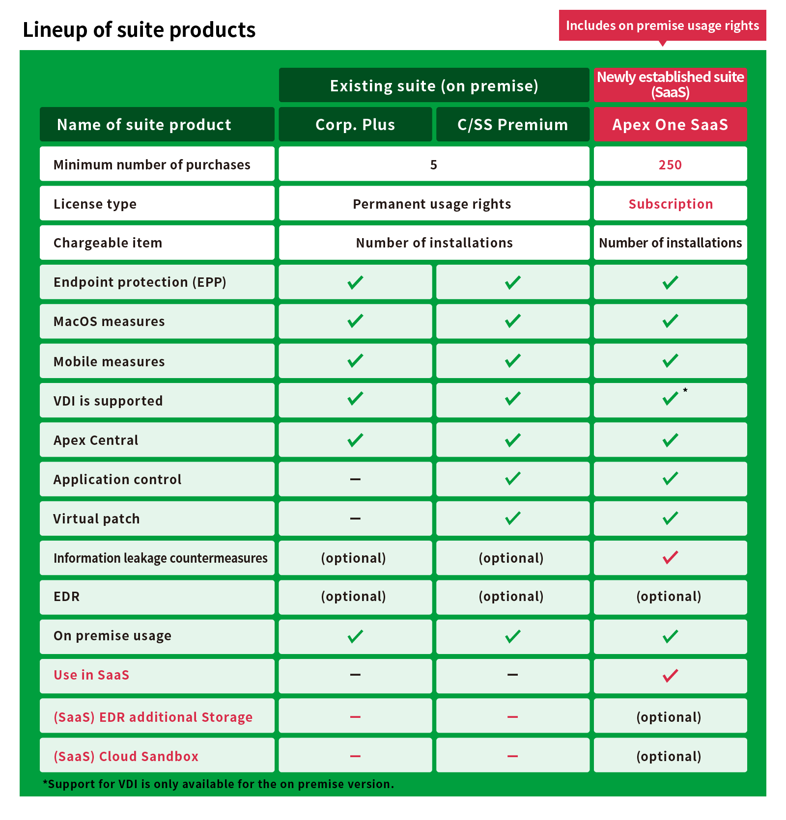 Apex One is an antivirus product that features an easy-to-operate user interface. Cyberattacks are increasing every year and a company will incur substantial time and monetary costs if it independently implements security measures against cyberattacks. Threats are changing and becoming more sophisticated on a daily basis which makes it difficult to manage devices such as computers that are removed from the company premises for teleworking, etc. Apex One assists customers in constructing a security environment that suits their situation. Apex One supports everything from product introduction to operation support; for example, enhanced advance protection against threats, reactive measures, and introduction of SaaS endpoint security.