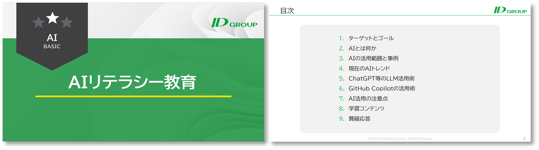 この研修では、AIに関する基礎知識や大規模言語モデルの効果的な使用方法、さらにAI導入時の留意点について学びます。