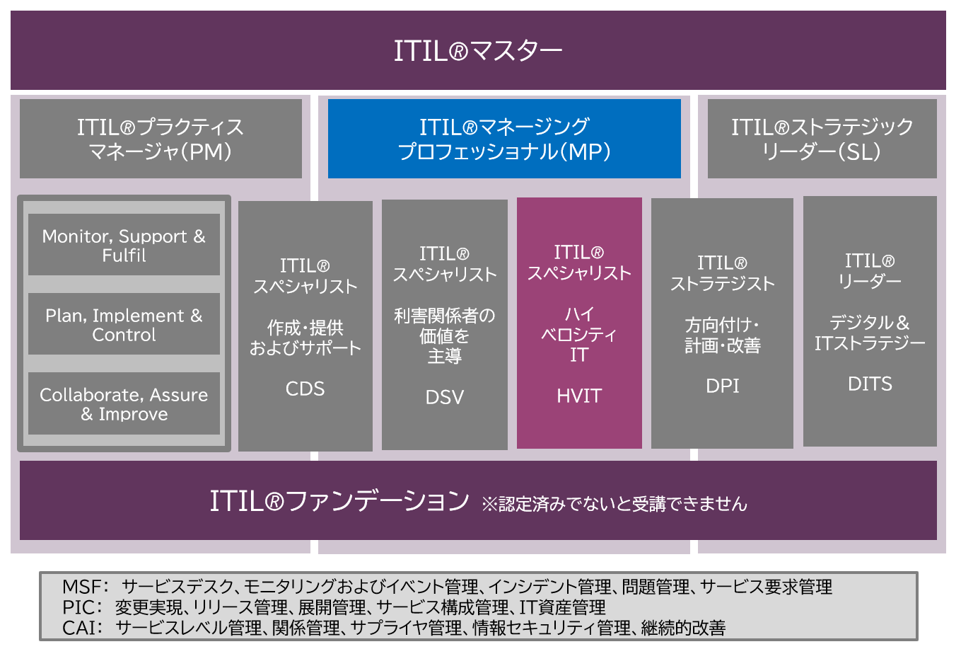 HVITコースは、マネージングプロフェッショナルモジュールに含まれており、受講条件となるファンデーション認定、およびCDS・DSV・DPI認定と合わせることでマネージングプロフェッショナル認定を得ることができます。