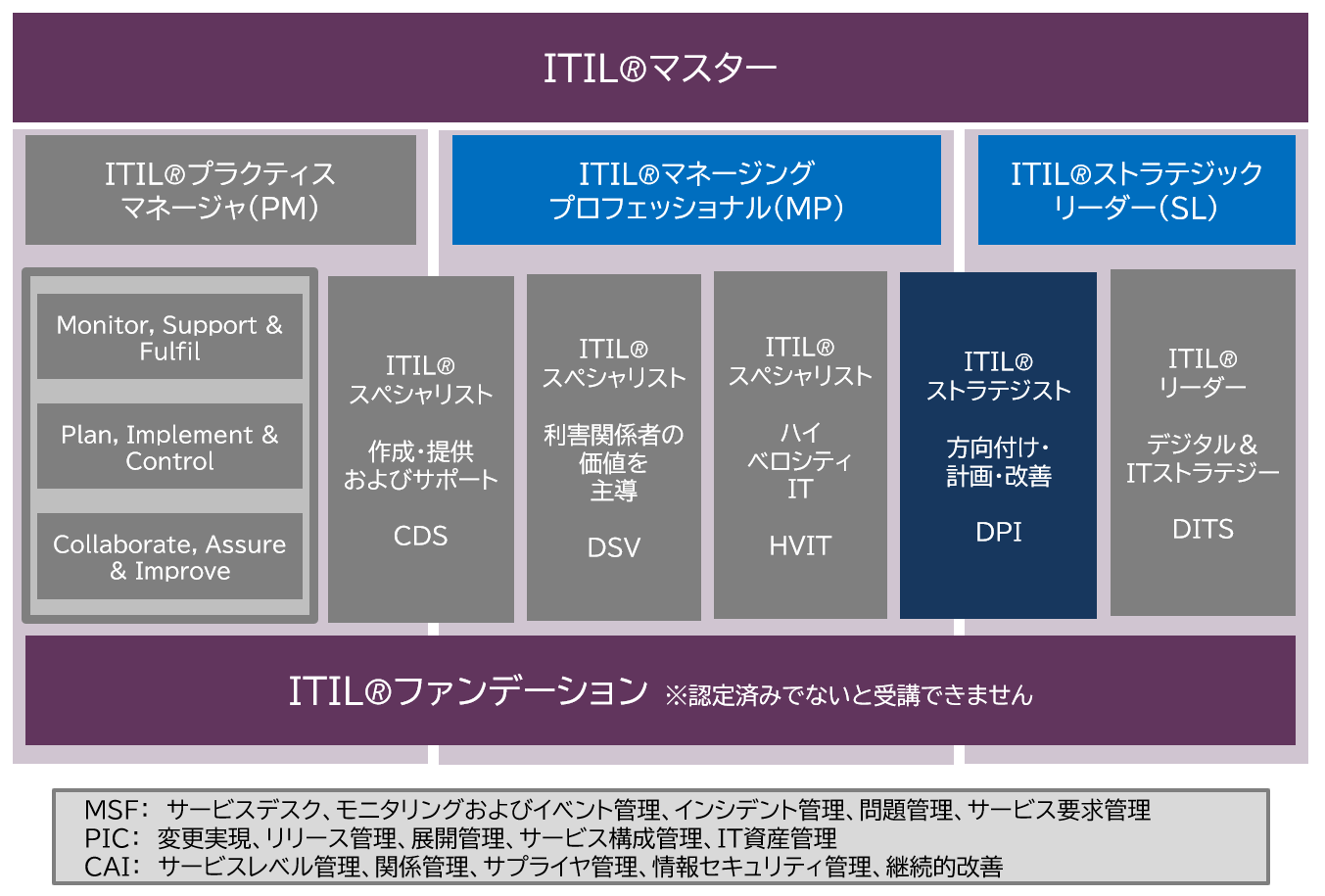 受講条件となるファンデーション認定、およびCDS・DSV・HVIT認定と合わせることでマネージングプロフェッショナル認定を得ることができます。