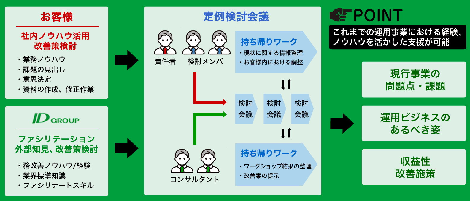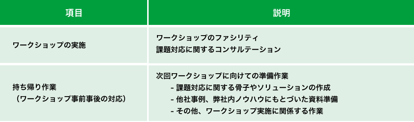 当社では、ワークショップ型としてお客様と共に経験豊富なコンサルタントが一体となり、お客様企業における高品質なサービスの実現に貢献いたします。
