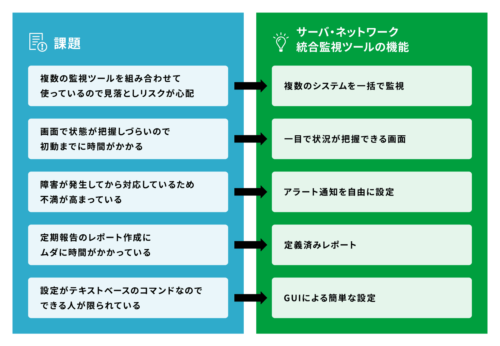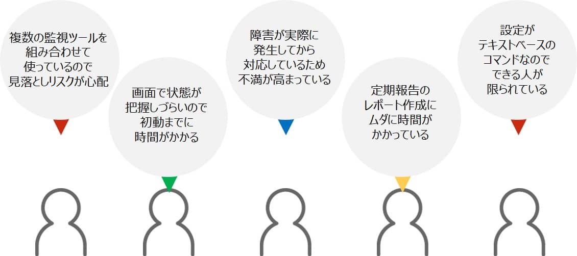 サーバ・ネットワーク統合監視における課題として以下のご意見が課題としてよく挙げられます。