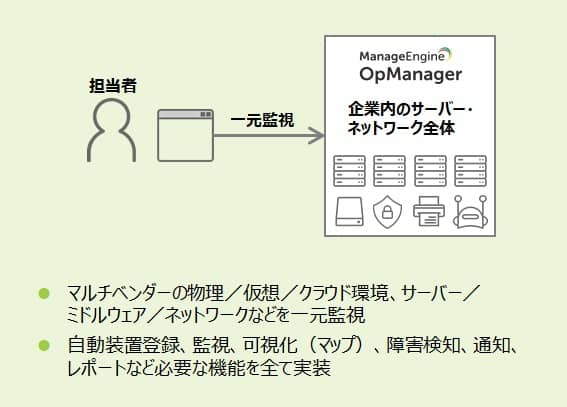 サーバ・ネットワーク統合監視ツール「OpManager」により、前述の課題を解決することが可能です。