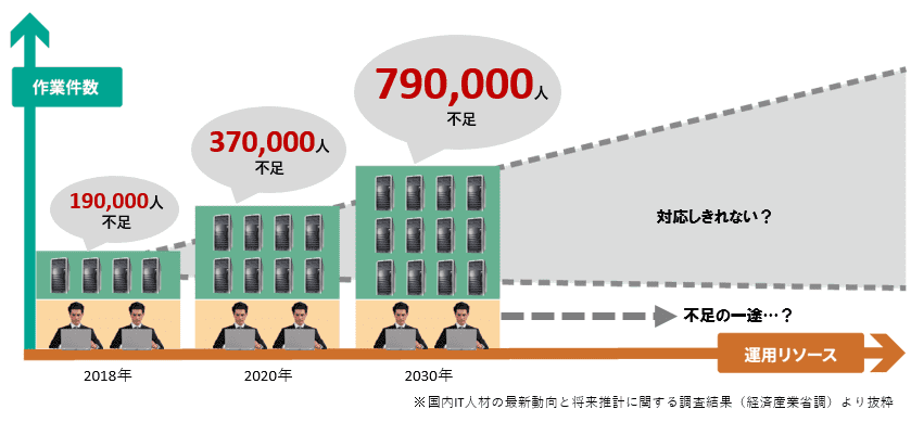 需要拡大の一方人材の確保が追い付かず、2030年、IT人材は79万人不足すると言われています。この課題を解決する唯一の方法が、運用業務の自動化です。