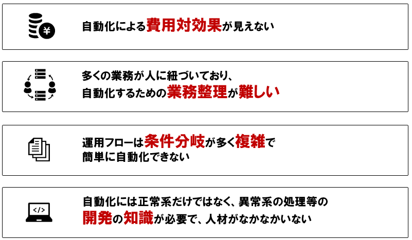 ひとつの運用フローでも、色々なシステムを利用しており、それらのシステムをつなげて自動化したい