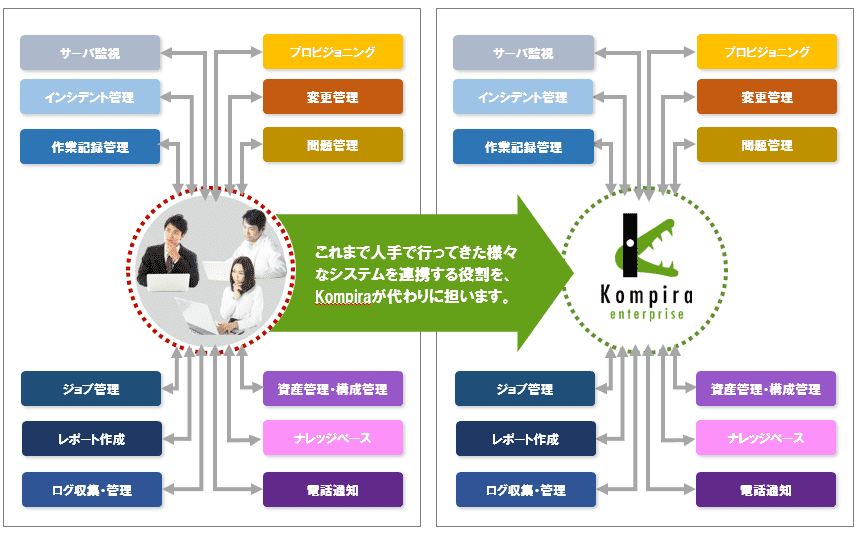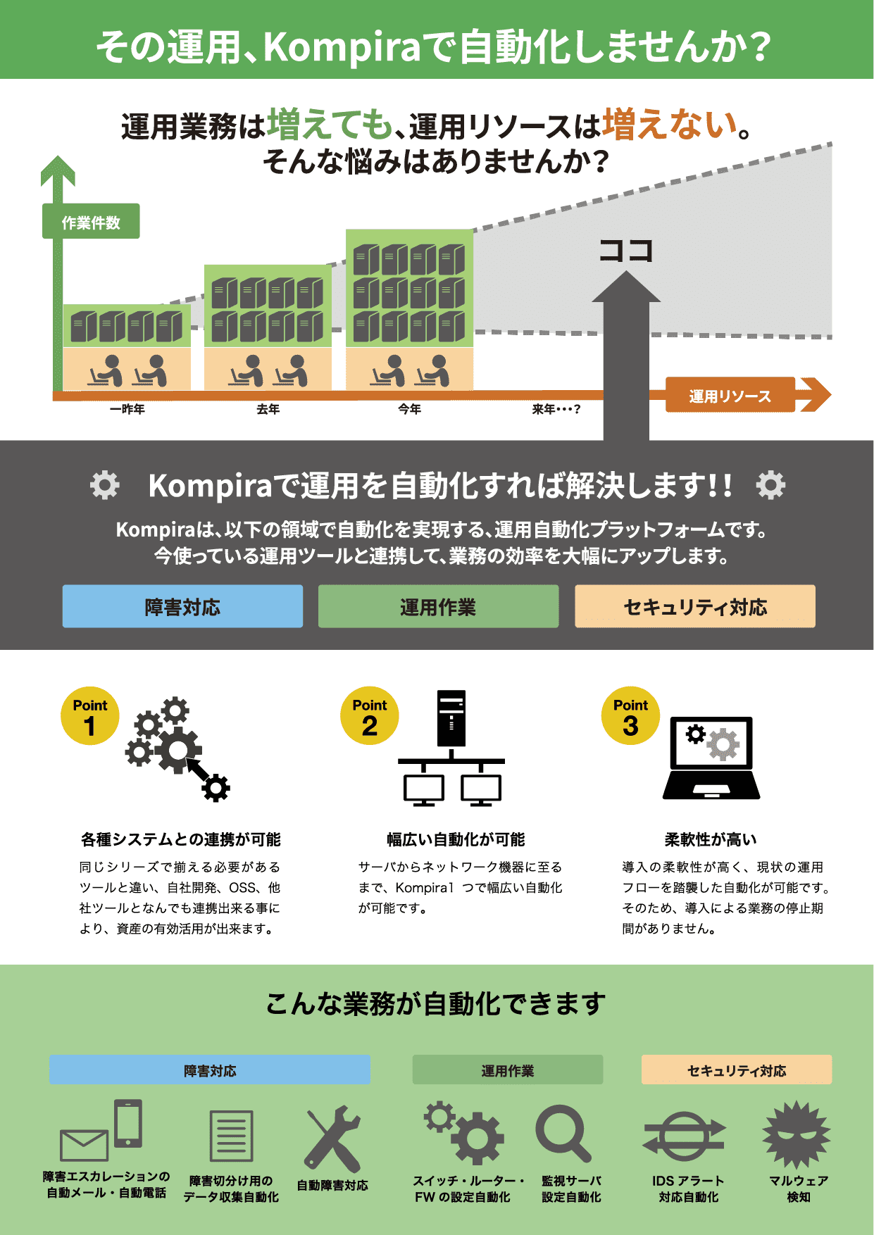 この内の自動化ソリューションとしては、フィックスポイント社の運用自動化プラットフォーム「Kompira enterprise」、各種RPA製品(WinActor、UiPathなど)の販売、構築をおこなっております。