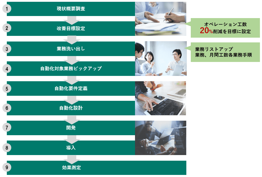 当社は、業務コスト最適化に向けた、現状分析と計画立案、業務/作業の標準化支援、自動化ソリューションの提供を柱とした、コンサルティングサービスを提供しております。