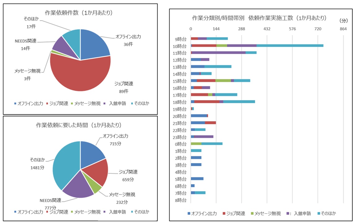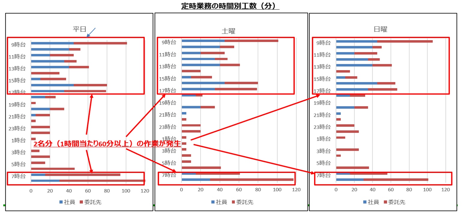 (1)現状調査文書確認および関係者ヒアリングを通じて、すべての業務を洗い出し、各作業の工数や実施頻度を整理・一覧化します。あわせて、営業日・非営業日の1日における定常業務の発生状況(時間帯・作業量)を可視化し、作業の集中度や負荷の偏りを明確にします。
