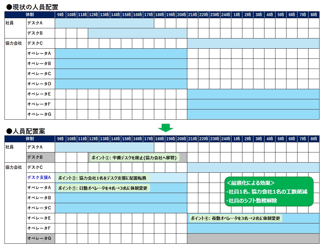 さらに、シフト体制および業務割り当ての分析を通じて、人員配置の最適化による削減効果も評価します。