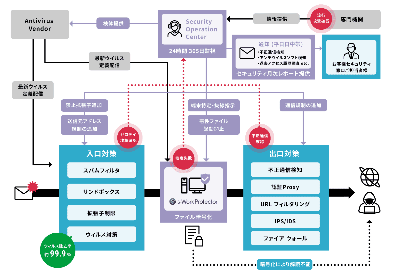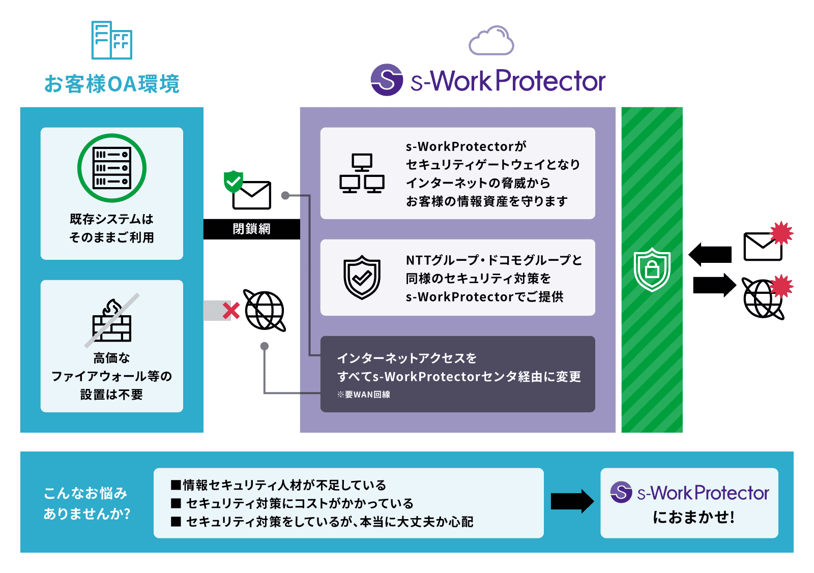 s-Work Protectorにおまかせいただくことで、インターネットの脅威から企業の情報資産を守ります!
