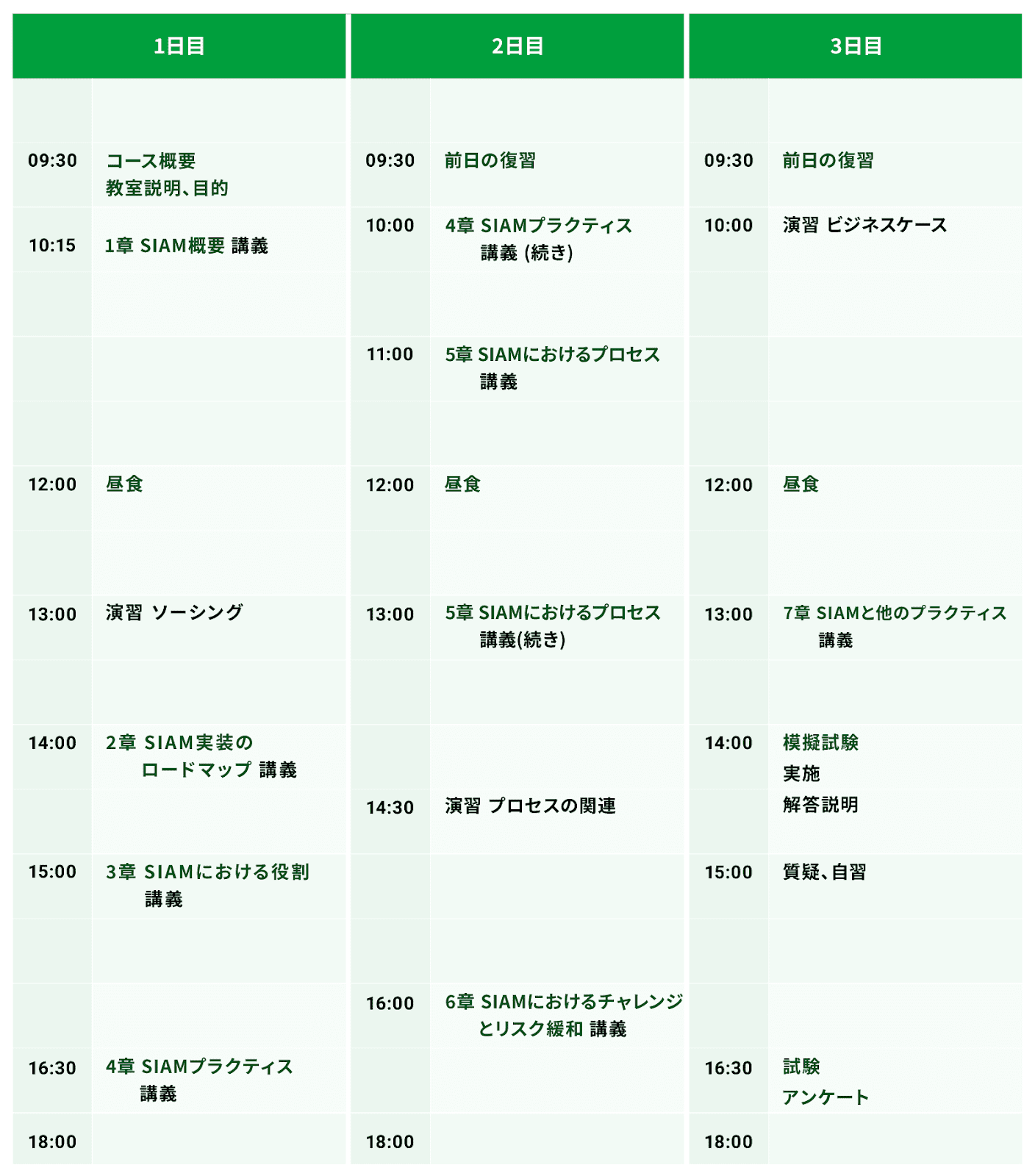・3日目は、模擬試験と解説、自主学習を行った後にSIAM™ファンデーション研修/試験の認定試験を行います。(オンライン研修の場合は、試験は別日)